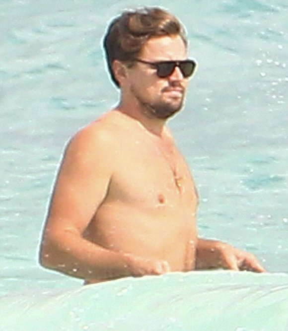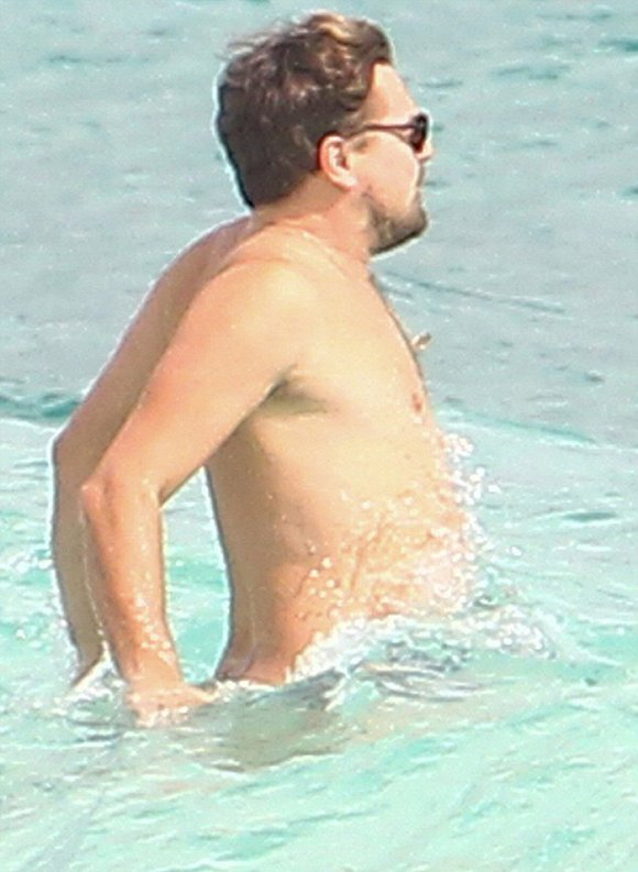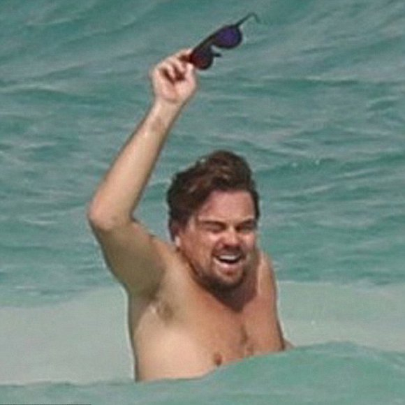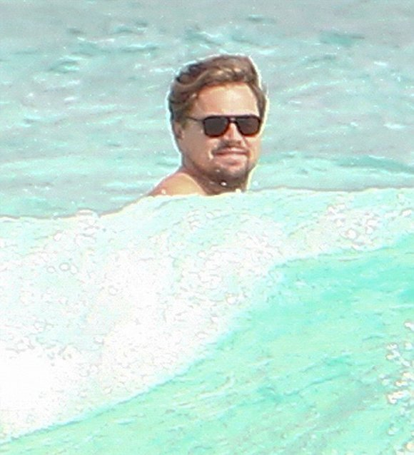 玩到兴头上的小李子还挺着肚子下了海,波浪不停地拍打在他的手臂和肚皮上。并且他看起来丝毫不介意自己中年发福的身材,穿着一条紧身游泳短裤。除此之外他也和大多数的好莱坞明星一样,墨镜是一定要随时戴着的。