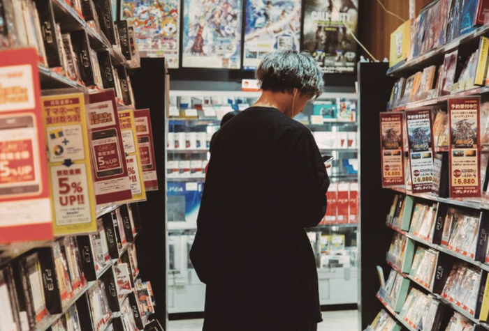 定位年轻化的「TSUTAYA」是年轻人的天堂。在音像区寻找电影的年轻人。