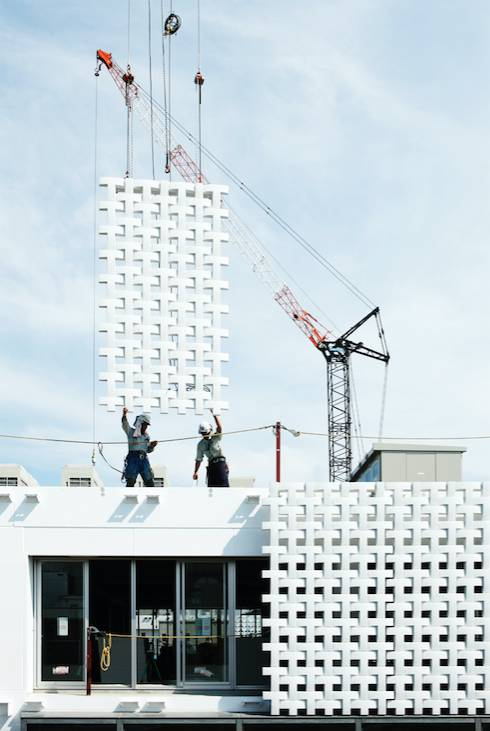 以TSUTAYA的T字相互连接构成的外墙,规则的四方形缝隙,营造出动态的印象。同时也像连环甲一样保护着内部。
