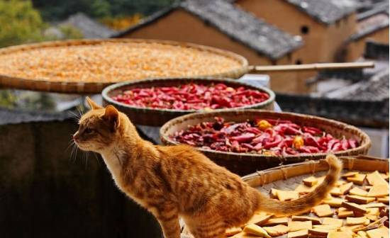 阳产村是一个依山而建的山寨,房子以土楼为主,土楼群是阳产村最大的特色,一座座,一排排,密密麻麻,一幢接一幢。深秋时节的皖南徽州,农家屋顶,各种果实你方晒罢我登场,铺成一幅幅五色斑斓的调色板,显摆着归仓前最骄人的风采。
