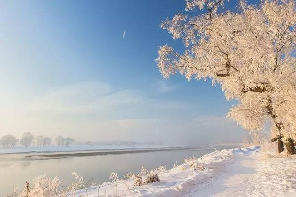 雾凇不是雪,也不是冰,而是树枝上挂的霜。沿着松花江的堤岸望去,松柳凝霜挂雪,戴玉披银,如朵朵白云,排排雪浪,十分壮观。