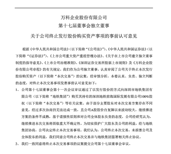 公司难以在审议通过本次发行股份购买资产相关议案的首次董事会会议决议公告后6个月内发布股东大会通知。考虑到公司A股股价自复牌以来波动较大,当前各方对本次交易方案的调整尚无法达成一致意见,经与深铁集团协商,公司董事会同意公司终止本次交易事项并与地铁集团签署《万科企业股份有限公司与深圳市地铁集团有限公司之发行股份购买资产协议之终止协议》。