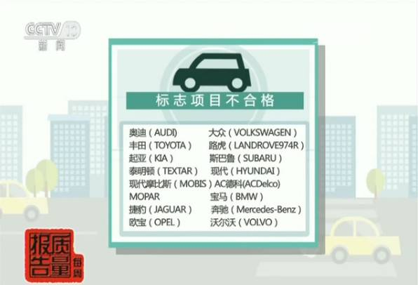 在质检总局公布的不合格产品名单中:标称品牌为路虎(Landrover)、现代(HYUNDAI)、丰田(TOYOTA)、奔驰(Mercedes-Benz)、奥迪(Audi)、大众(Volkswagen)、泰明顿(TEXTAR)、起亚(KIA)、沃尔沃(Volvo)和宝马(BMW)存在10批次以上产品抽查不合格的情况。