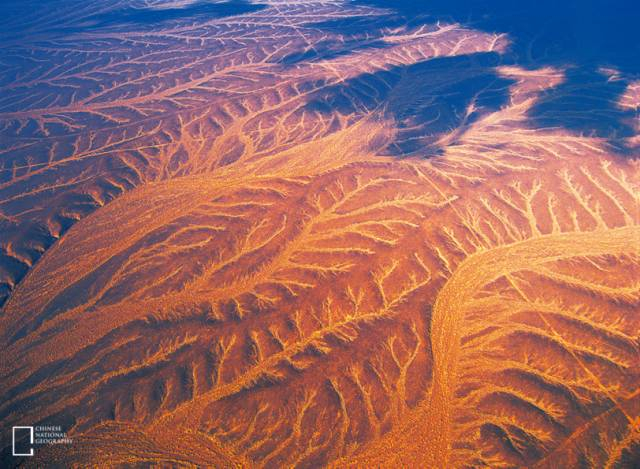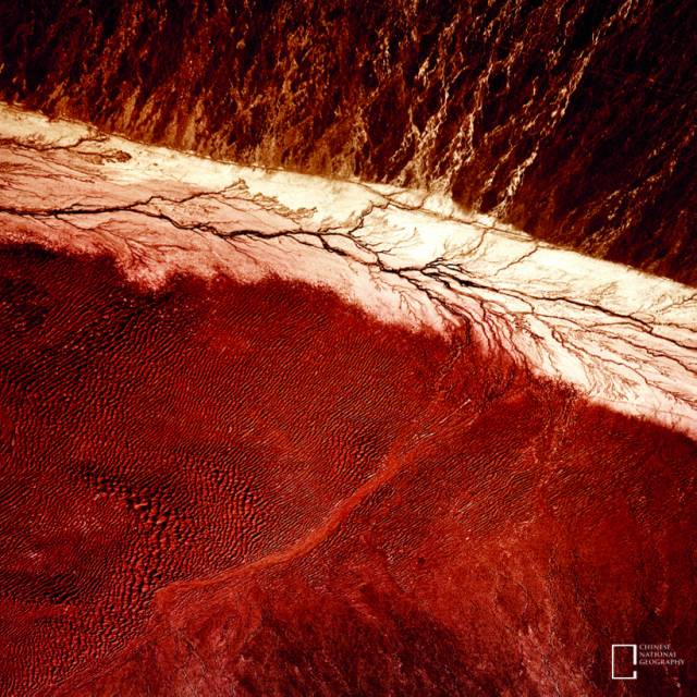 塔里木河是中国第一大内流河,全长 2179 公里,由叶尔羌河、和田河、阿克苏河等汇合而成,静静地流淌于塔里木盆地北部地区。摄影师乘坐民航班机飞临塔里木河时从数千米的高空拍摄此照片,呈现了塔里木河流域干枯印记和塔克拉玛干地区特有的地貌。
