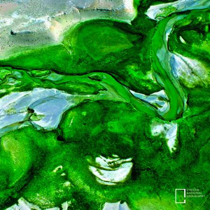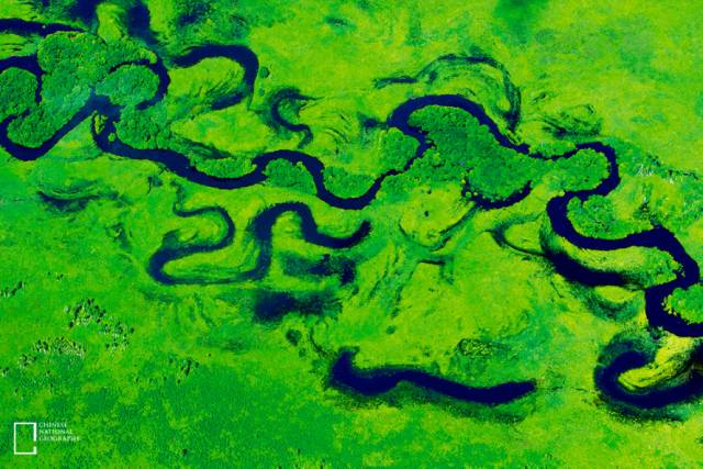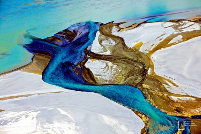 这是摄影师沿着青藏铁路行进时在那曲拍摄的高原湖泊,清澈的湖水看起来像在山间谷地之间散乱而随意地流淌,它们时而分岔,时而聚合,使岩石的节理和湖水的色泽都交融在一起,看起来像是迎风挥舞的裙裾,抽象的肌理令人不禁感叹大自然的鬼斧神工。