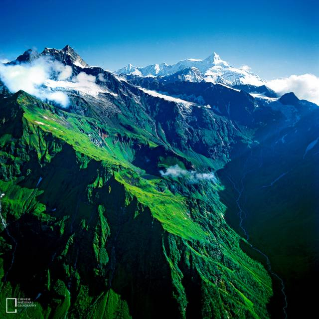 航拍背后的艰险也鲜为人知。2006年8月20日,摄影师田捷砚终于等来了多雄拉山口云开雾散的日子,他的目标是南迦巴瓦——2005年《中国国家地理》评选的中国最美的十大名山之首。实际上,从1998年航拍南迦巴瓦开始,他一直尽量在不同的时间段、从不同的高度和角度来全方位地表现它。直升机9点准时起飞,沿着雅鲁藏布江飞越南迦巴瓦,最后到达墨脱。这条航线非常神奇,10分钟内从海拔5000余米下降到海拔500余米,可以拍到春夏秋冬的景色变换;这条航线也非常艰险,曾经有2架直升机在此折翼。每次他航拍南迦巴瓦,都带有一种对战友无比的怀念与崇敬之情。这张照片是他在老虎嘴上空远眺南迦巴瓦时拍摄的。它看似平常,其实拍摄过程异常艰难。最大的问题是相机,他带的相机受不了从极寒到酷暑的温差变化,8台相机和镜头全部结雾出水。另外,青藏高原的寒流和印度洋的暖湿气流在此交汇,出现强烈的扰动,使飞机经常处于猛烈的颠簸之中。在这种情况下,你可以想象拍摄到这张完美表现南迦巴瓦雄姿的照片有多么不容易。
