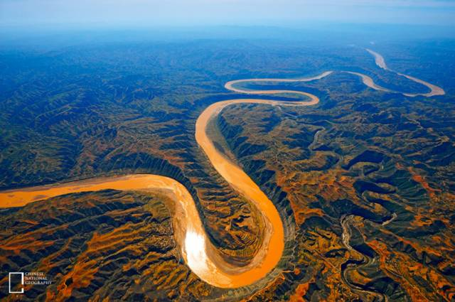 王之涣在著名的《凉州词》中写道:“黄河远上白云间”。意为,遥望黄河,好像丝带一般飘到了天空中。空中航拍九曲黄河远去的图片,巨龙似的黄河在黄土高原的深谷中蜿蜒向东。图中黄河右下方为陕西省延川县。照片中的第一个大弯是位于陕西省延川县境内的黄河乾坤弯。