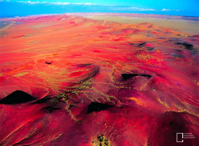 这张犹如火星表面的图片摄于新疆的鄯善,这里东西向横亘着天山东部的一条支脉:火焰山。不论是在地面,还是在高空,火焰山把太阳的热力毫无保留地反射给大气。热浪滚滚,一切生命的迹象被烧了个干净!谁曾想到,就在不远处,博格达峰奔流而下的雪山融水,浇灌出了7 公里长的葡萄沟。