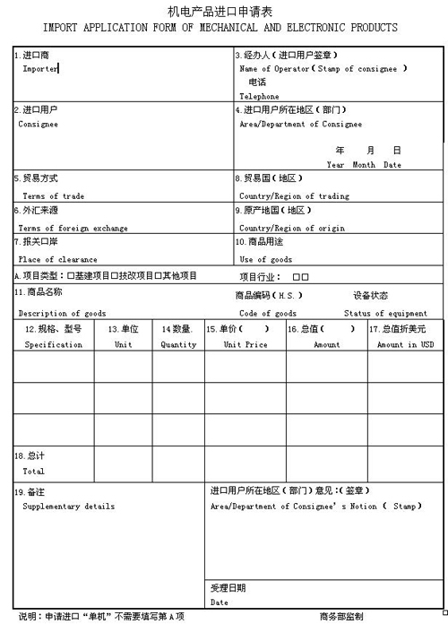 1、书面申请程序:申请进口单位可到发证机构领取或从商务部授权网站(http://www.chinabidding.com)下载(可复印)《机电产品进口申请表》,与其他相关书面材料一并提交到相应的主管机构。