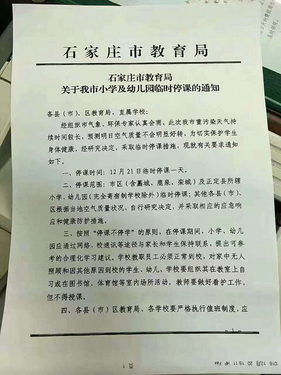 重污染天气将持续 石家庄市区及正定县小学、幼儿园21日临时停课一天