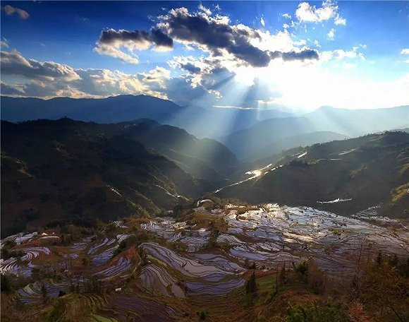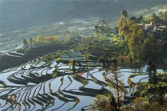 元阳的梯田每年12月灌水,到了第二年1月正是最漂亮的时候,这期间田地里没有稻子,平平整整的梯田极有层次感,在阳光的照射下更是层层透亮,光影效果极佳。