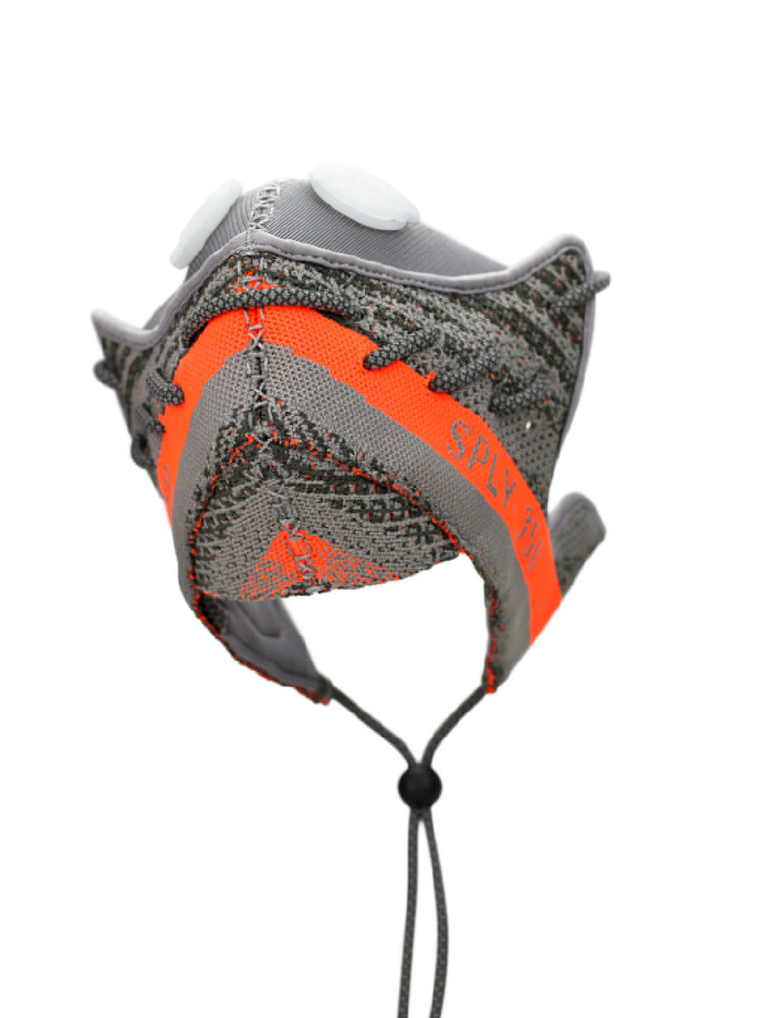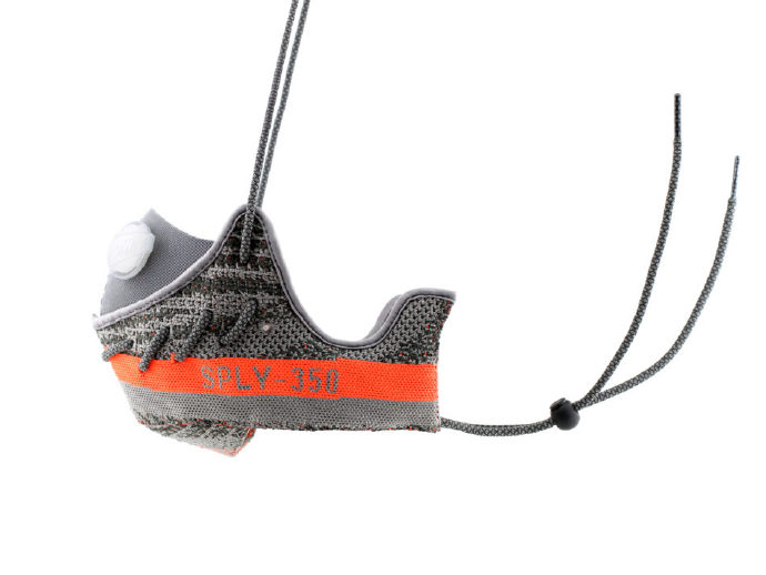 Yeezy口罩使用了两个半片的Yeezy橙灰色针织鞋帮,王志钧特意保留了标志性的橙色条纹以及“SPLY-350”字样,并用鞋带绑定。有趣的是,除了Yeezy的时尚外观,王志钧还安装了英国进口过滤阀。