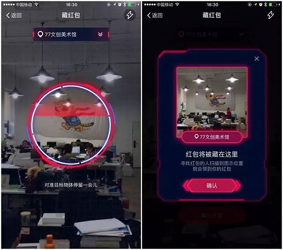 AR实景红包基于“LBS+AR+红包”的方式,用户在发、抢红包时,都需要满足地理位置和AR实景扫描两个条件。相比于既有的红包形式,互动性和趣味性都强了很多。