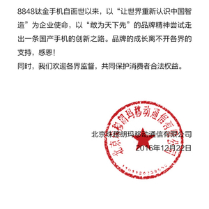 8848钛金手机自面世以来,以“让世界重新认识中国智造”为企业使命,以“敢为天下先”的品牌精神尝试走出一条国产手机的创新之路。品牌的成长离不开各界的支持,感恩!