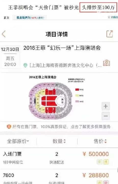 而不过1天,高达7800的票价,在黄牛市场已经被炒到288000,内场A区一排位置票炒到599999,1排1号2号叫价甚至高达100万。