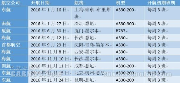 12月中旬,南方航空(600029.SH)一架空客A330客机降落在澳大利亚阿德莱德机场,首条从广州到南澳的直飞航线正式开通,几天后,东方航空(600115.SH)上海直飞布里斯班的航线也紧随其后,差不多一个月前,公司刚刚开通了北京-杭州-悉尼以及昆明-悉尼两条到澳洲的新航线。