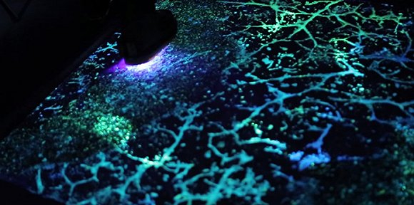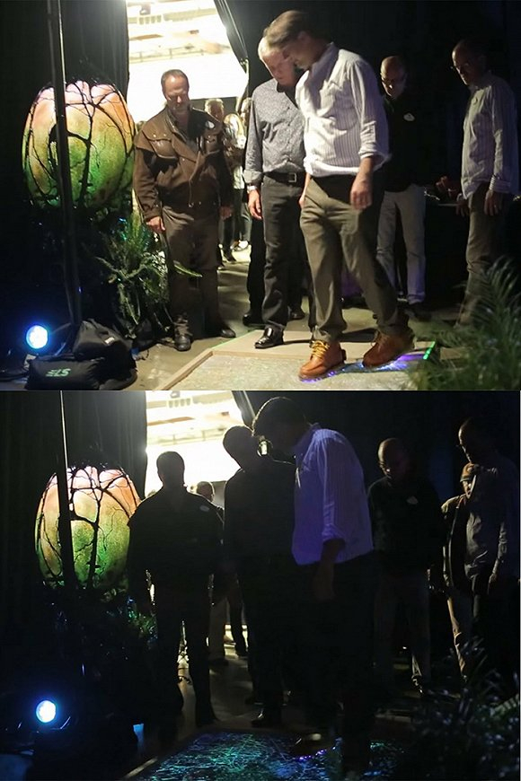 上图中的地毯关了灯后的特写,在感受到重量后,地毯的受压部位也会发光。