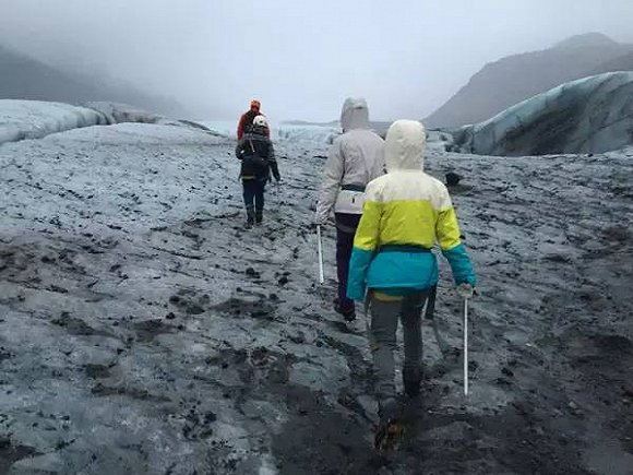 我们报的团其中之一就是冰川徒步,这是整个行程里我认为继极光之后的最值得体验的项目。冰川徒步需要预约时间,需要自己先到集合地集合,向导会给您配备冰爪、冰镐以及防滑带,我们去的时候正在下雨,但是没办法打伞,所以这就体现了防水防风衣的重要。穿好装备后,向导开车将我们带到冰川附近,这样,神奇的冰川徒步就正式开始了。