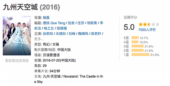 与之类似的还有《九州天空城》,该剧因“带美瞳的妖艳贱货”而一度成为热门搜索。这部完全是由90后年轻演员撑场的偶像玄幻剧,在豆瓣上的评分仅有5分。