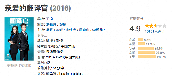 然而这部披着行业剧外衣的都市言情剧,剧情主线依然是男女主角在谈情说爱,“翻译官”这个鲜明的职业身份在剧中完全没有体现出其专业素养,该剧也沦为一部极其平庸的偶像剧。豆瓣上,这部剧的评分只有4.9分,有28%的观众给出了一星评价。