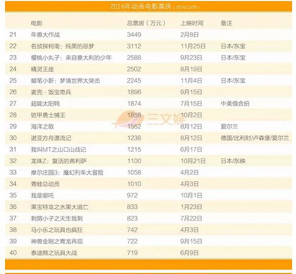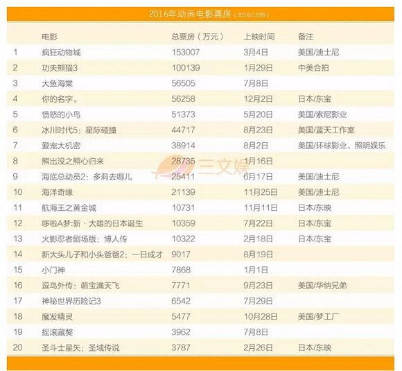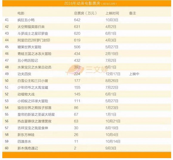 除了这两部即将上映的电影之外,目前2016年的其他60部动画电影一共收获了68亿票房,超过去年的45亿。