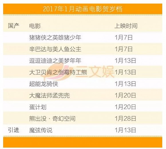2017动画电影展望,1月贺岁档火爆尽管2016年国产动画电影市场遇冷,但从去年到今年腾讯影业、阿里影业、光线传媒等公司都发布了多项动画电影的计划,明年仅1月就有8部国产动画电影上映,引进定格动画《魔弦传说》也赶在了这个档期,还有《姜子牙》、《无敌乒乓兔》、《十万个冷笑话2》等原定于今年上映的电影也可以期待,此外《小门神》的导演王微,在新的一年将带来《阿唐小来的奇幻之旅》。