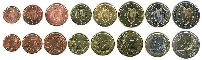 △爱尔兰欧元硬币背面图案是该国国徽——竖琴