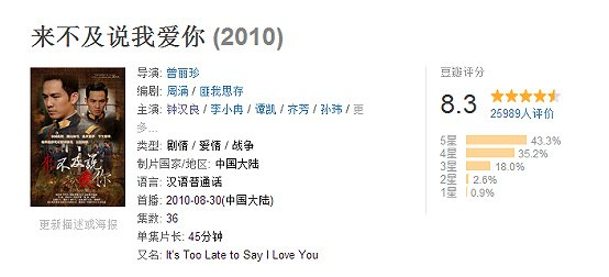 而钟汉良的作品也渐渐有了口碑保证,2009年,钟汉良正式进军言情小说界,出演改编小说《来不及说我爱你》,在豆瓣得到了国产剧8.3的高分,小说改编剧评分能高过这部的作品为数不多。