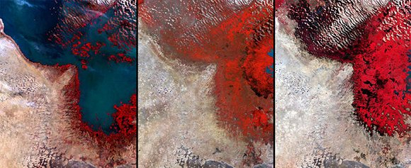 非洲乍得湖,从左到右分别为1972年、1987年和2002年拍摄的卫星图。这个全球第六大湖泊正因为严重的旱灾在慢慢消失。