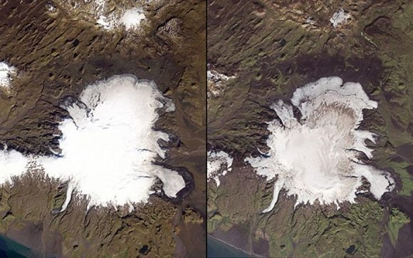 图中是冰岛第四大的冰盖Myrdalsjökull,通过对比你会发现它的面积正在快速的缩小。左图拍摄于1986年,右图为2014年。