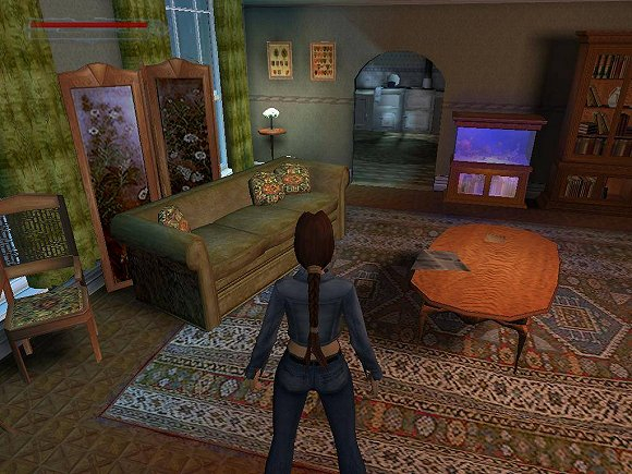 《古墓丽影:黑暗天使》截图。尽管《黑暗天使》的首要开发平台是PS2,但游戏也有电脑版。问题是,移植是在PS2版做出来后才匆匆上马的,而游戏的操作是按照PS2手柄来设计,电脑可没有什么手柄。