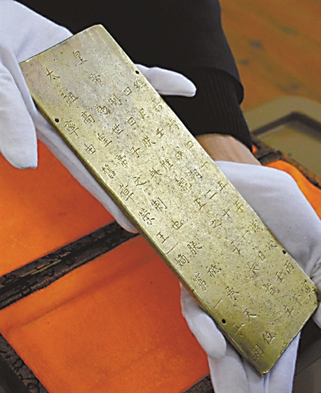 这页金封册出水时间为2011年,出水地点位于彭山岷江大桥以上江中。吴天文说,这页金封册应是封面,内容大致是张献忠在成都称帝后,颁布政令法规,“其规格比圣旨还要高!”而在质地上,金封册更是全部用黄金所制,这一页重量达700多克。