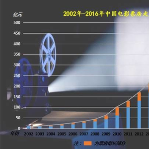 2003年,全国电影票房收入11亿元。比上年增长15.79%。进入2004年以后,全年电影票房的增速一直保持在25%以上,大部分年份增长率在35%左右,2010年和2015年达到井喷,增长率分别是64.03%和48.9%。