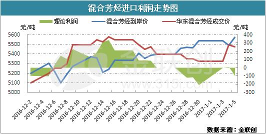 据金联创分析,布伦特收盘价持续上涨与国内需求疲软是导致进口混芳亏损的两大原因。具体来看:一方面,自冻产会议意外达成以来,布伦特价格一举突破53美元/桶,虽然美元走强、API库存及美国活跃油井数施压油价,但外盘价格依旧保持坚挺,截至2017年1月5日,收盘价涨至56.46美元/桶,进口混合芳烃成本面压力大增;另一方面,原油外盘的坚挺对国内油品市场交投难有提振。周初适逢元旦假期,调油市场观望气氛浓厚,市场鲜有成交达成,故调油商对于进口混合芳烃购入有限。进入2017年,华北、山东等地在雾霾笼罩中跨年,多数调油商暂停操作,山东等地进口混芳出货困难,贸易商低价至5300元/吨,至此,华北进口混合芳烃一周价格降至最低位。随着雾霾过去,进口混合芳烃市场交投略有回暖,但成交价格推涨缓慢,贸易商依旧处于亏损状态。