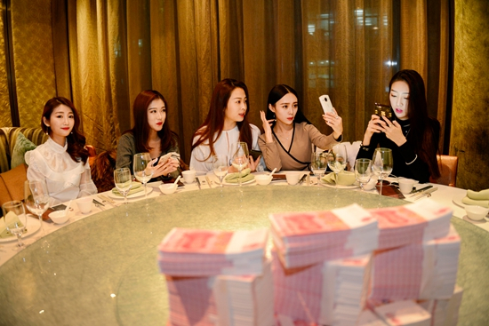 1月5日,北京,北京辰星盛世公司准备了上百万元现钞,为几名美女主播现场发放年终奖。据了解,这些年终奖是发放给在前一年中表现出色的几名网红女主播,现场每名女主播领到了15万至25万不等的人民币。 几名女主播与堆成“小山”的上百万元现金。视觉中国供图
