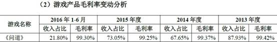 2013 年至2016 年1-6 月,作为公司营业收入和利润主要来源的《问道》游戏,其毛利率分别为99.42%、99.37%、99.25%和99.30%,基本稳定且保持在较高水平,主要由于该游戏产品采用了授权运营模式。在授权运营模式下,公司成本支出相对较少。由于《问道》商业化运营已达十年,在版本维护、打击外挂、防私服等方面,都已经形成成熟的方案,因此公司所需承担的运维成本支出也相对较少。
