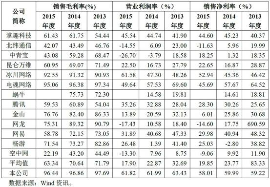 招股书显示,由上表所示,同行业公司销售毛利率均较高,且各公司毛利率有一定的差异,主要由于各公司游戏运营模式、游戏产品类型、营业规模和收入结构等的不同所致,其中冰川网络、电魂网络、金山、网龙、畅游和本公司毛利率位于行业前列。同行业公司营业利润率和销售净利率各公司之间以及部分公司各年度之间均存在较大的差异,其中掌趣科技、冰川网络、电魂网络、网易和本公司营业利润率和销售净利率位于行业前列。