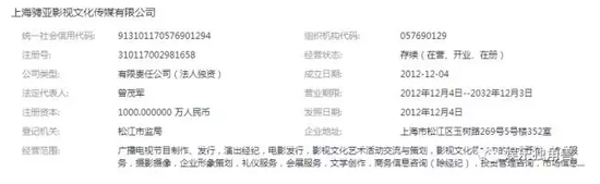 此外陈思诚旗下还有一家名为上海骋亚的影视传媒公司。据悉,这家公司正是2012年陈思诚在筹备《北爱》电影版时成立的,注册资本为1000万人民币,注册日期为2012年12月4日,法人代表为曾茂军,陈思诚本人则任该公司总经理。