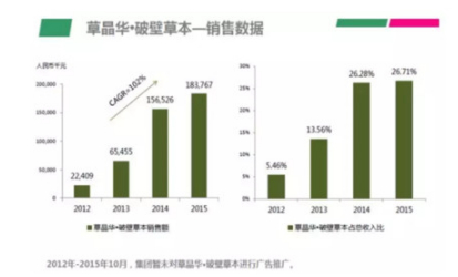 而制药业务收入约3.29亿,较同期的2.94亿增长约11.7%;毛利增长约21.3%至2.09亿(2014年:172.9百万元)。其中,核心产品“草晶华破壁草本”2015年收入达到1.83亿,相较于2012年仅0.124亿元,年复合增长率近200%,占据制药业务总收入的46%,其毛利率高达70%以上。与此同时,草晶华系列的破壁草本2012年销售收入占公司总收入仅为5.46%,至2015财年占比已达到26.71%。看到如此好的增长趋势,该公司一时间还被业界预测为“第二个王老吉”,市值曾一举跃至19亿港元。