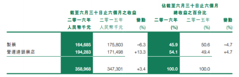 进入2016年后,中智药业上半年营运连锁药店的收益增长约13.3%至1.94亿(2015年上半年:1.71亿),占期间总收益的54.1%(同期49.4%);毛利增长约10.6%至8870万(同期8020万)。制药业务则取得1.64亿,占期间的总收益的45.9%;毛利约1.09亿。