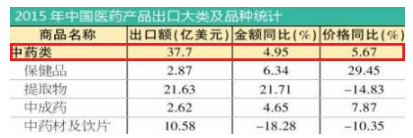 截止2015年,我国中药产业年产值已超过人民币7800亿元(单位下同),占国内医药市场的25%左右,较20年前增长了30余倍。其中,中药类产品出口总额37.7亿美元,同比增长4.95%。