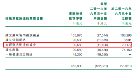 主营业绩为净利润遮羞之际,中智药业也开始加强自己核心技术“破壁饮片”的投入。根据2016年中报披露,该公司公开发售及配售本公司股份所得款项净额约为4.52亿港元,已用于研发投入1140万港元。