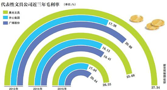 在2015年,晨光文具、齐心集团以及广博股份的文具业务,毛利率分别为26.55%、17.04%、20.44%。晨光文具书写工具的毛利率是31.71%。张雪莲认为,这与文具行业所属的轻工行业毛利率本身偏低有关。