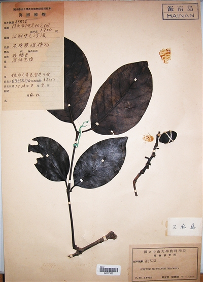 左景烈、陈念劬1932年在海南采集的植物标本。现存于中国科学院华南植物园标本馆。 (资料图)