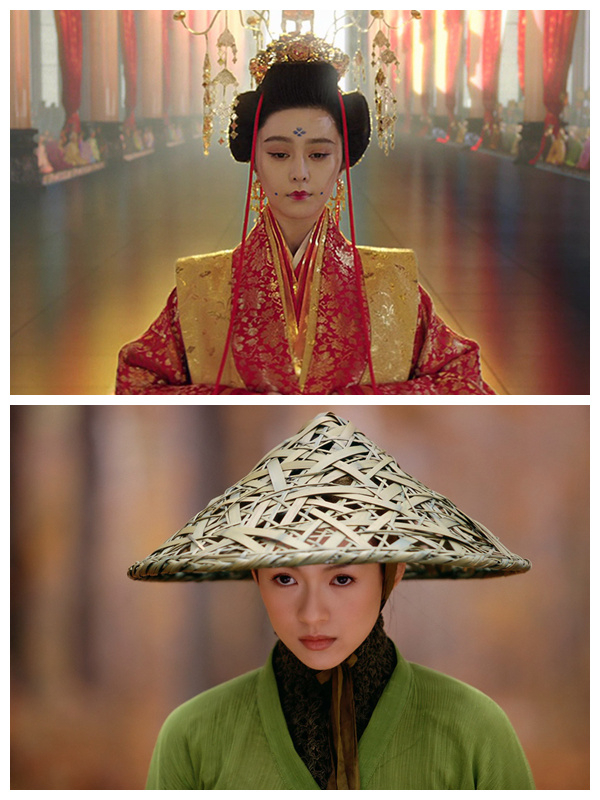 和田惠美为范冰冰设计20公斤戏服(上),为章子怡设计京都风格的手工草帽(下)