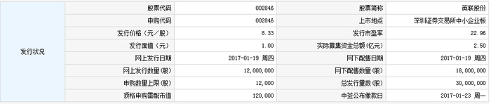 中国证券网讯 根据交易所公告,广东英联包装股份有限公司于2017年1月19日进行网上和网下申购。公司本次发行规模不超过3,000万股,回拨机制启动前,本次发行网下初始发行数量为1,800万股,为本次发行总量的60%,网上初始发行数量为1,200万股,占本次发行总量的40%。公司本次发行价格为8.33元/股,发行市盈率为22.96倍。股票简称为“英联股份”,股票代码为“002846”,拟在深交所中小板上市。