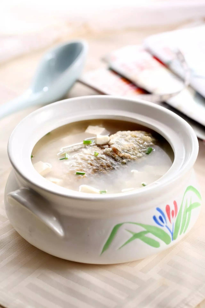 砂锅鱼头豆腐,用花鲢(即胖头鱼)头,劈为两半,下冬菇、扁尖(腌青笋)、海米,汤清而味厚,非海参鱼翅可及。