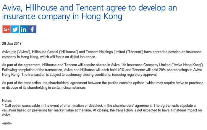 作为协议的一部分,高瓴资本和腾讯将收购英杰华人寿(香港)的部分股权。交易完成后,英杰华、高瓴资本各持有英杰华(香港)40%的股权,腾讯持有20%的股权。该交易还需相关监管部门批准。