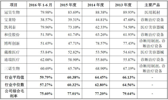 公司称,鉴于目前上市公司中没有生产与本公司产品相同或相似的企业,故本次选择的标准和确定的理由是基于可比上市公司的生产规模,经营业绩水平等。公司选取冠昊生物(证券代码:300238)、宝莱特(证券代码:300246)、凯利泰(证券代码:300326)、和佳股份(证券代码:300273)、博晖创新(证券代码:300318)、戴维医疗(证券代码:300314)、迪瑞医疗(证券代码:300396)、三诺生物(证券代码:300298)等8家上市公司作为同行业可比对象。