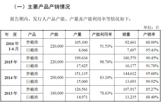 招股书显示,2013年-2016年1-6月,产能利用率分别为78.63%、83.10%、98.76%、51.53%。据统计,公司 2012 年至 2015 年合计销量约 56.67 万片,按照用户每人购买一对镜片估算,四年合计购买镜片人数约为 28.33 万人。此外,公司早在 2000年即成立,成立至 2011 年共销售角膜塑形镜累计超过 24 万片,购买镜片人数累计超过 12 万。因此,自公司成立至 2015 年发行人用户人数超过 40 万。